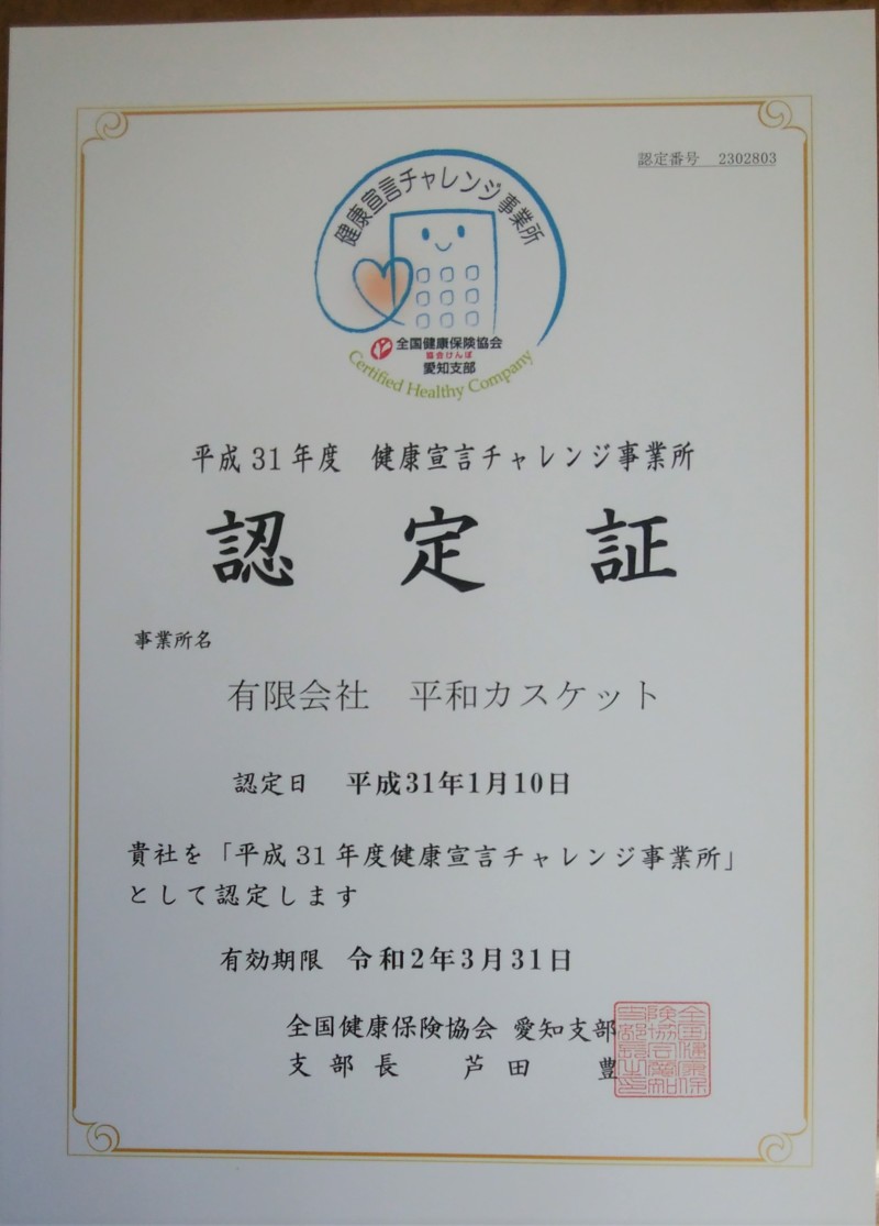 平成31年度 健康宣言チャレンジ事業所に認定されました。
